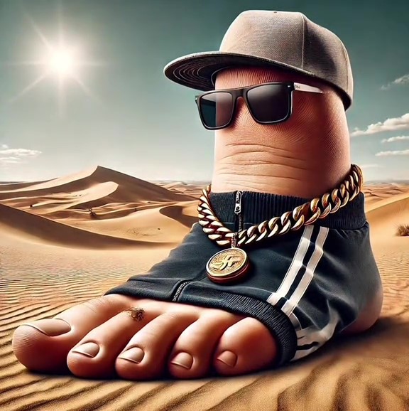 An AI-generated Italian brainrot meme character featuring a foot with human-like facial features, sunglasses, and a hat, depicted as a mafia boss in desert settings